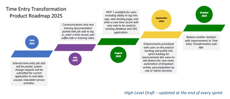 Summer 2025: First MVP release, allowing case workers to enter new time records via the web-based system that integrates with the existing SSIS application and databases.